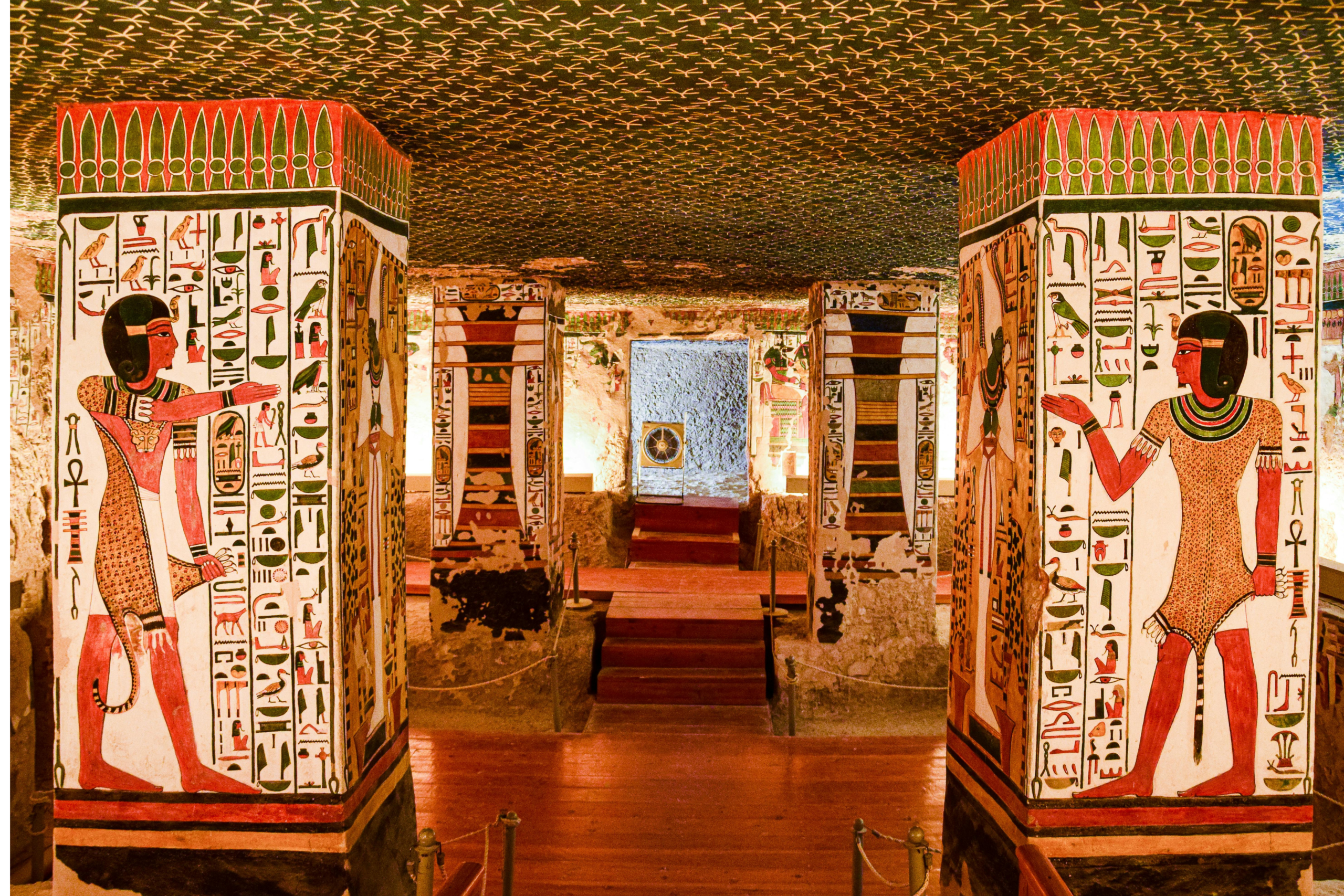 The chambers are covered with bright wall paintings and sacred hieroglyphs.